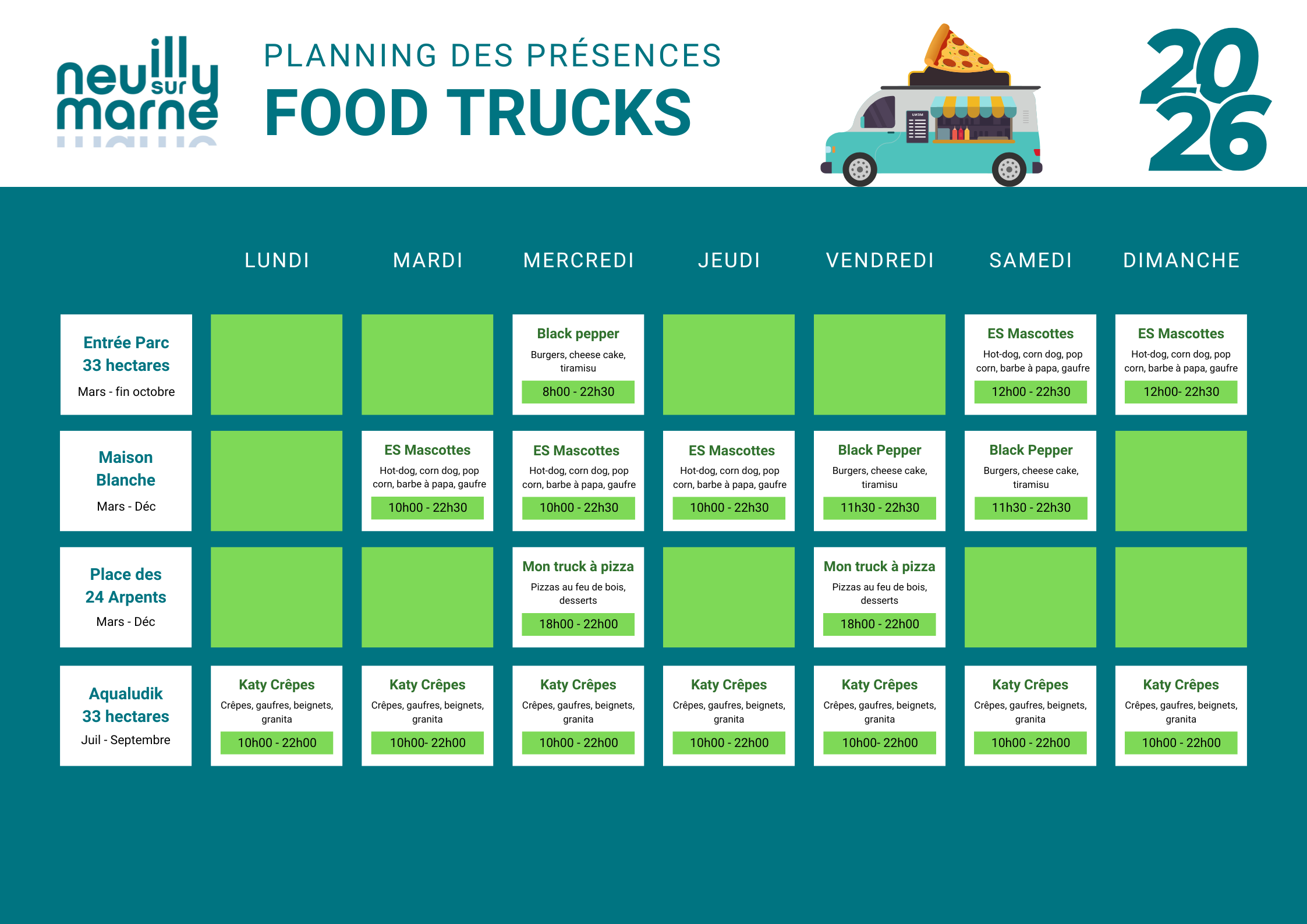 Du lundi au dimanche, de 8h à 22h30, Neuilly accueille une rotation de food trucks répartis sur plusieurs sites de la ville.